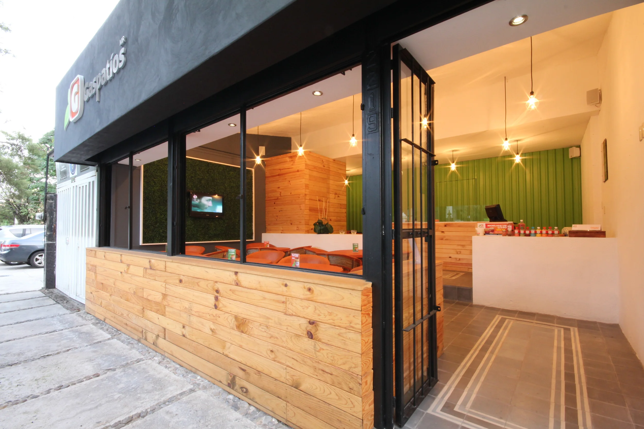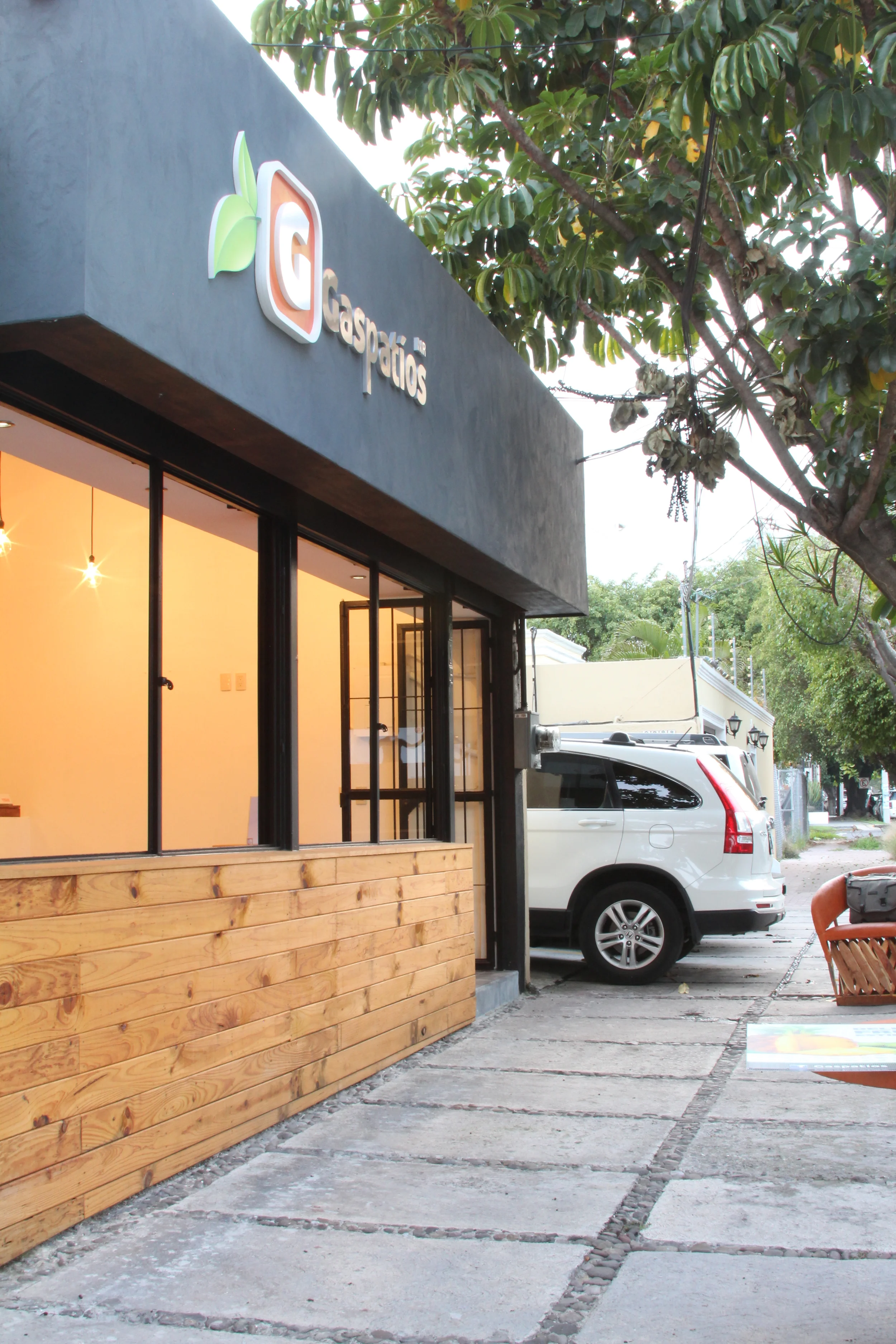 La intención es la de dar el sentimiento de un lugar que se preocupa por la naturaleza, la salud y la sustentabilidad. El producto principal en una mezcla de frutas preparadas de una manera especial llamada “Gaspacho” originales de Morelia Michoacán, traídos a Guadalajara para ser los primeros de la ciudad. El reto fue la integración del mobiliario local llamado “Equipales” al diseño. El cubo cubierto de duelas de madera, el marco con arbusto y el color verde de la lámina del fondo fue la traducción de la idea que estábamos buscando. El piso está hecho con mosaicos tradicionales que se complementaron con el mobiliario existente.